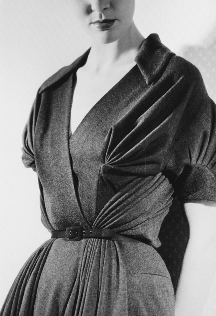 C’est en 1935 que Germaine Krebs crée sa maison de couture. Mariée à un artiste, elle joue avec le pseudonyme de son mari pour adopter le nom sous lequel le monde de la Mode la connaît encore aujourd’hui: Alix Grès. Son style est épuré, son inspiration nourrie par l’Antiquité grecque.