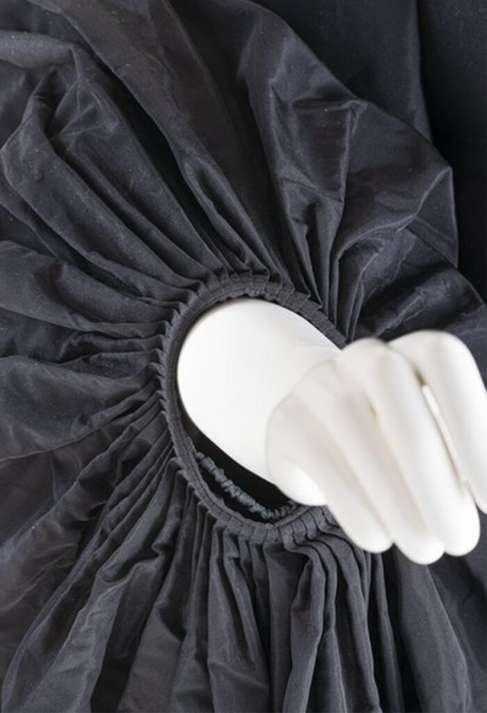 Le « pli Grès » transforme radicalement l’essence du tissu. Précis, il crée, sans alourdir le vêtement, un effet souple et sculptural.